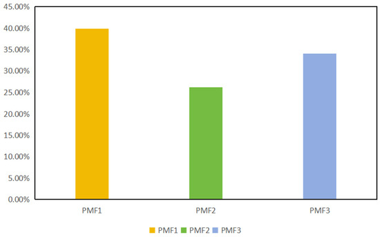 The positive matrix factorization (PMF) model is a receptor model that can determine the contribution value of the pollution source to the receptor. Its application premise is that there is no value less than 0 in the source contribution matrix and the pollution source matrix, and the source contribution matrix (gik) and the source component spectrum matrix (fkj) are obtained [41]. The specific calculation formula is