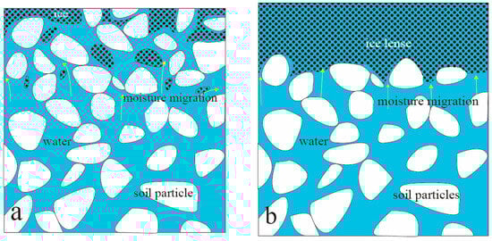 Freezing-induced swelling is a principal cause of construction-related issues in cold regions, primarily due to moisture migration and ice lens formation [,]. The increasing amount of construction of high-speed railways in these areas demands higher anti-freezing and expansion standards, emphasizing the importance of understanding moisture migration and ice lens mechanisms, which are directly linked to pore water pressure [].