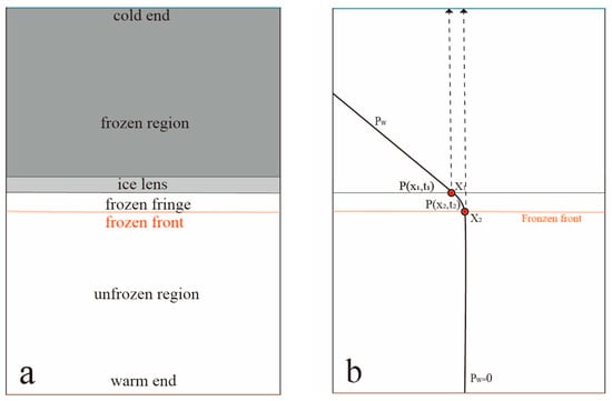 Neil and Miller define the difference between the external load and the effective stress as the neutral pressure, and when the maximum neutral pressure is less than the external load, an ice lens is not produced []. As shown in Figure 1, at this time, at the frozen fringe, the pore water pressure is not high enough to produce an ice lens []. The frozen fringe satisfies the following boundary conditions:
