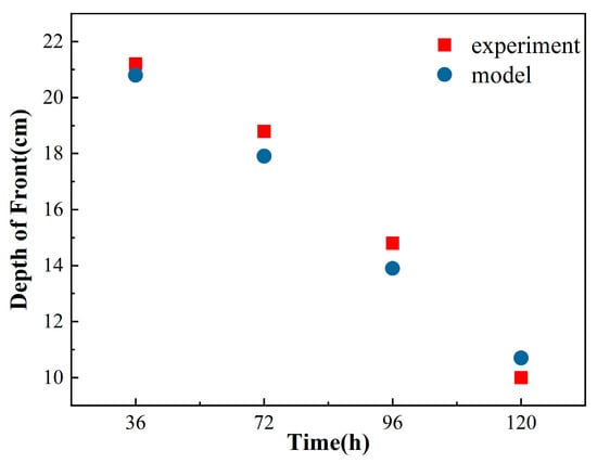 The freezing fringe is a critical zone for phase change and water migration, characterized by the swift transition of pore water from liquid to solid states. This area’s boundary, known as the freezing front, demarcates the transition zone. For instance, at a cold-end temperature of −5 °C, as depicted in Figure 3, the freezing front progressively descends over time, with the descent rate diminishing as the duration of freezing extends. This observation is corroborated by experimental data, validating the accuracy and feasibility of the numerical simulation approach.