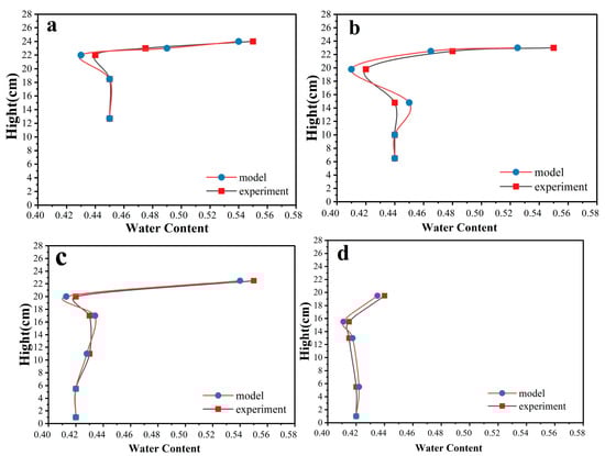 Experimental and model water content variation with time at different heights. The freezing times are (a) 36 h, (b) 72 h, (c) 96 h, and (d) 120 h, respectively.