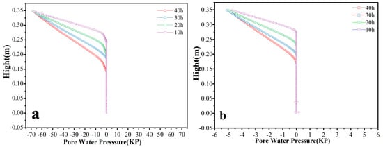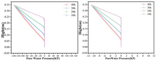 As shown in Figure 6, the peak frozen soil pore water pressure reaches −10.93 at a cold-end temperature of −10 °C and after a freezing time of 10 h. However, its peak value does not change after 40 h of freezing. This is attributed to the fact that, at a colder temperature, the unfrozen water at the frozen soil column’s surface will quickly freeze. Consequently, at the freezing fringe, the rate of decrease in pore water pressure is much higher than at a cold-end temperature of −5 °C.