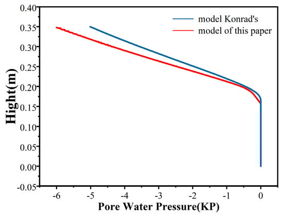 The results of the model presented in this paper and those of the Konrad model calculations almost overlap at the freezing fringe, as illustrated in Figure 7. However, in the frozen region close to the top of the soil column, the temperature of the frozen soil is lower, and the amount of pore ice is higher. As a solid, pore ice exhibits some adsorption for pore water, which results in the actual pore water pressure value being lower than the results predicted by the Konrad model calculations. The calculation results of this paper are notably consistent with this characteristic and demonstrate that the calculation formula used in this paper aligns more closely with the actual pore water pressure.