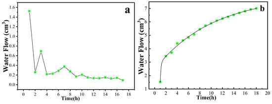 Variation in water flow (a) per unit of time and (b) total water flow with time.