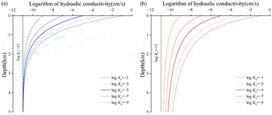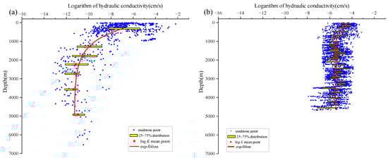 Distribution of hydraulic conductivities with depth in a depth range of 0–7000 m, (a) sandstone, and (b) mudstone.
