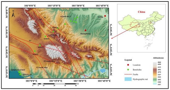 The Qinghai engineering project area is situated in the vicinity of Xining City, Qinghai Province, China (Figure 2). This region is characterized by its rugged mountains and deep gullies, with elevation ranging from 2600 to 3500 m. The project area’s topography and geomorphology consist of three major geomorphological units: tectonic denudation and erosion of alpine–mid alpine, tectonic erosion of mid-mountain hills, and erosion of river valleys. The stratigraphy is discontinuous and incomplete, with the spatial distribution of each stratum influenced by the regional geological structure.