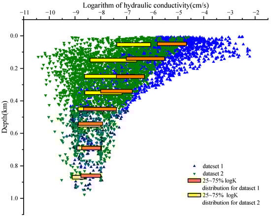 Two datasets with similar Log Kr values were selected from the metamorphic sub-dataset to test the performance of the two models, namely the proposed exponential model and the power-like model. Dataset 1 is from the igneous dataset and Dataset 2 is from the metamorphic dataset. As shown in Figure 3, the box-and-line shows the surface hydraulic conductivity (at the depth approach 0) for Dataset 1 is about two orders of magnitude greater than that of Dataset 2. On the other hand, residual hydraulic conductivities (at the depth of about 1 km) for the two datasets do not differ by more than 0.5 orders of magnitude.