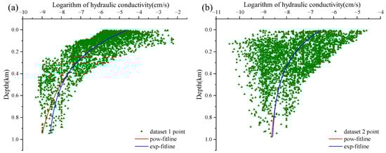 Subsequently, Figure 6 illustrates the K–Z relationship for two sedimentary sub-datasets based on rock hardness classifications (the sandstone sub-dataset and the mudstone sub-dataset). Within 0–7000 m, mudstone’s hydraulic conductivity spans from (−13 to −3), which is a notably broader range than sandstone’s (−8 to −3). Therefore, the range of mudstone is significantly larger than that of sandstone. Furthermore, at greater depths, the hydraulic conductivity of mudstone is notably lower, potentially due to the presence of muddy debris in soft rock causing blockages in the rock’s channels. At a larger depth range (roughly 0–6000 m), the exponential model expressions for mudstone and sandstone at this depth are: