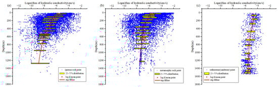Distribution of hydraulic conductivities with depth in a depth range of 0–1600 m, (a) igneous rocks, (b) metamorphic rocks, (c) sedimentary rocks (sandstone).