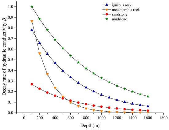 Figure 7 presents a graph depicting the relationship between the decay rate β and depth for igneous rock, metamorphic rock, sandstone, and mudstone at a depth range of 0–1600 m (β is normalized using data from these rock types, while the normalization method is in the chapter “Normalization Method” of Supporting Information). The graph reveals three distinct stages in the decay process for each rock type. (1) At very shallow depths (roughly less than 200 m), mudstone demonstrates the quickest decay rate, with metamorphic rock, igneous rock, and sandstone following, respectively. (2) Within moderate depths (roughly 200–500 m), it continues to be mudstone that experiences the most rapid decay, with igneous rock following mudstone, metamorphic rocks in the slower decay rate, and sandstone decaying the slowest. (3) Beyond roughly 500 m, mudstone still shows the highest decay rate, with igneous rock, sandstone, and metamorphic rock following, respectively. Additionally, as indicated in Figure 5, Figure 6 and Figure 7, metamorphic rocks reach the residual hydraulic conductivity at the shallowest depth, succeeded by sandstone, igneous rocks, and mudstone. Metamorphic rocks reach complete decay stability at only about 1500 m. The depth required for the remaining rocks to decay to stability is not clear.