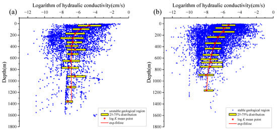 Figure 9 illustrates the influence of geological stability on the K–Z relationship. Stable regions display a broader range of hydraulic conductivities, with the middle 50% of their distribution spanning from −9 to −4 in logarithmic values. In contrast, the corresponding range for dynamic regions is from −8 to −4, suggesting a narrower distribution. Additionally, hydraulic conductivities in unstable regions reach residual levels at shallower depths compared to the stable regions.