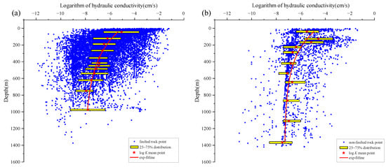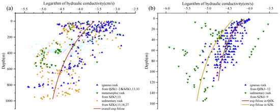 Figure 11a shows the general hydraulic conductivity data of the project area. The three rocks are distributed similarly at shallow depths less than 200 m. The hydraulic conductivities of igneous rocks are much higher at 200–600 m. The data across all rock types exhibit an exponential decay pattern, represented by the equation: