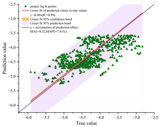 Therefore, the distribution of hydraulic conductivities in the project area can be summarised by the above three equations (Equations (8)–(10)). Then, to evaluate the fitting effect of the exponential model, the project area’s hydraulic conductivities were predicted with the above Equations (8)–(10). The true values were then plotted against the predicted values, as shown in Figure 12.