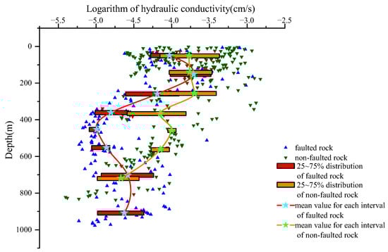 In Figure 13, it can be seen that at 0–500 m, the red line is more inclined to the left than the green line. This is because the fault core passes through boreholes, and the permeability at the fault core is lower than that of normal rocks. After 500 m, the red line shifts to the right due to the fact that this is a fault damage zone, and the core of the fault does not pass through boreholes. There is clear trend that faulted rocks’ hydraulic conductivities initially decrease and subsequently increase with depth. Furthermore, the logarithmic hydraulic conductivities of boreholes that cross the fault have a wider range than those that do not pass through it due to the existence of faults. These findings align with Jacek Scibek [] and the above research on the permeability distribution pattern of faults. The presence of faults introduces significant variability in subsurface hydraulic properties, emphasizing the need for detailed analysis in areas with complex geological structures.