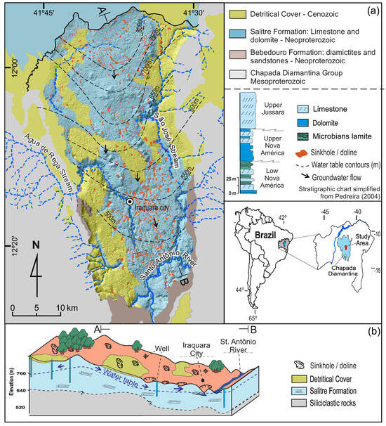 (a) Location, schematic geological map of the central region of Chapada Diamantina and detailed stratigraphy for the Salitre Formation. (b) Detailed hydrogeological conditions for the Salitre Karst Aquifer (SKA). Modified from [,].
