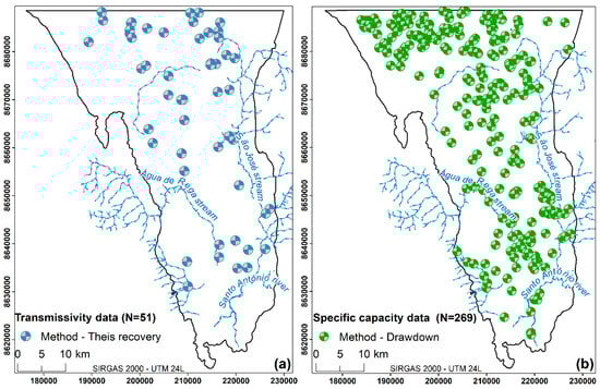 Location of the Salitre aquifer pumping wells used in this study. (a) Well data from the CERB database used for the calculation of transmissivity T by the recovery method [] and of specific capacity Sc. (b) Specific capacity well data available on all databases.