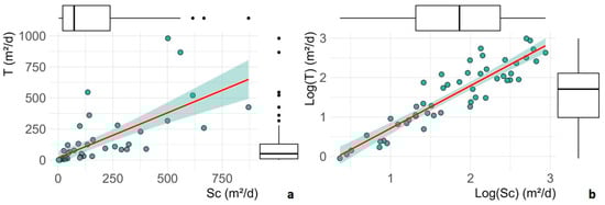 Figure 3a shows the correlation between T and Sc with a linear regression fit as well as the univariate distributions represented by the boxplots for each parameter. These boxplots show positive skewness, indicating the predominance of small values close to zero over few large values above 500 m2/d. After applying a logarithmic transformation with base ten (log10 where the base “10” will be omitted from now on), a symmetrical distribution is achieved and both parameters have a good linear correlation (Figure 3b). The normality tests [] for logT and logSc resulted in p-values of 0.17 and 0.19, respectively, and therefore, the null hypothesis of normal distributions was not rejected.