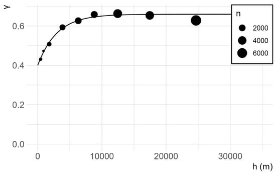 In a typical situation, the variance increases with the distance among sampling points up to a maximum level (sill) that corresponds to the total variance []. Here, the theoretical variogram is visually adjusted to the empirical variogram points from Equation (1), giving higher importance to shorter lag distances to optimize for spatial interpolation.