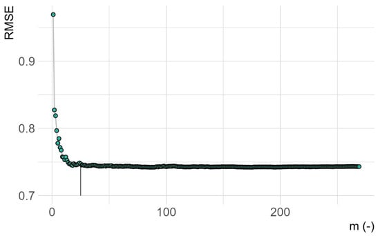 Variation in RMSE from cross-validated logTemp values in m2/d as a function of the number m of nearest neighbors used in ordinary kriging (vertical black line indicating optimum value chosen of m = 25).