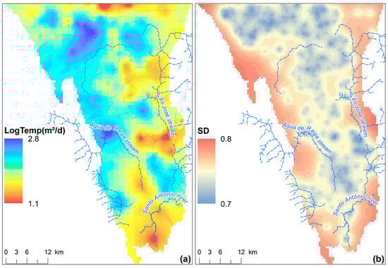 The ordinary kriging estimates for logTemp values as a function of the 25 nearest neighbors as well as the theoretical semivariogram from Figure 4 are shown in Figure 6a. The results yield logTemp values (with Temp in m2/d) that range between 1.1 and 2.8, displaying the highest values throughout the western boundary and in isolated areas of the central regions of confluences from the surrounding drainage network. These areas are fed by surface water deriving from the metasedimentary rocks of the Chapada Diamantina Group and account for the allogenic recharge of the SKA [,]. On the other hand, Figure 6b shows that the highest ordinary kriging standard deviations of logTemp are at the contact zones between the SKA carbonate rocks and the underlying basement rocks since these areas have a low density of groundwater wells (fewer data points).