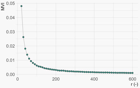 Decrease of the mean variance increment (MVI) with a growing number of realizations r used for the stochastic simulation.