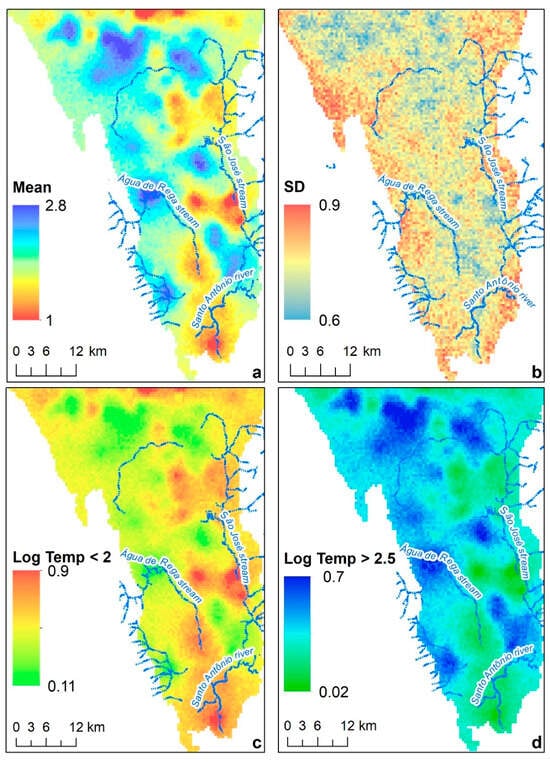Spatial representation of results from 500 stochastic realizations of logTemp (with Temp in m2/d). (a) Means of logTemp at each location, (b) standard deviations SD, (c,d) probability of logTemp values lower than 2 (i.e., Temp < 100 m2/d) and higher than 2.5 (i.e., Temp > 316 m2/d), respectively.