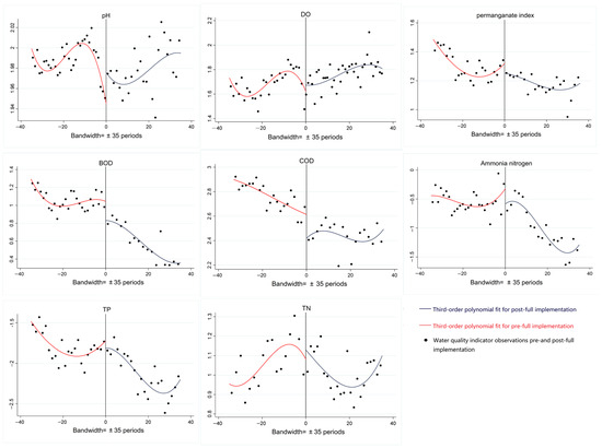 Before estimating the discontinuities, Figure 2 shows the scatter plots of the eight water-quality monitoring indicators near the discontinuities and their fitting curves, respectively. The three-order polynomial regression model better fitted the changes in 35 periods (months) before and after the RCS’s full implementation in Guangdong Province. As shown in Figure 2, several water quality indicators, including CODMn, BOD, NH3-N, COD, TP, and DO, had obvious breakpoints near the RCS’s full implementation, while pH and TN had no obvious discontinuities. These findings indicate that the RCS positively impacted the water quality of rivers in Guangdong Province. Meanwhile, pH levels consistently met the required standards, though clear discontinuity was not shown in their trend.