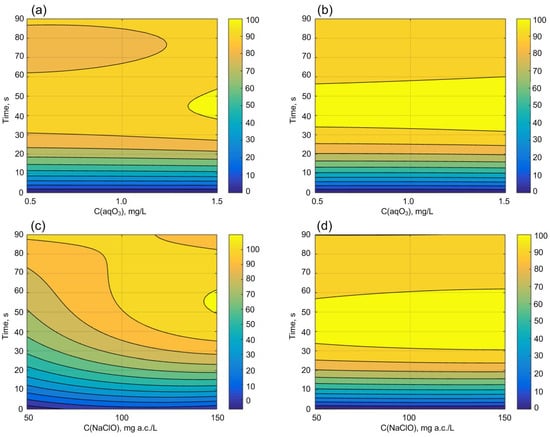 The results evaluating the effectiveness of aqueous ozone against Gram-negative bacteria Escherichia coli, immobilized on metal and polymer plates, are presented in the Supplementary Materials in Figures S7–S9. The processed data in MATLAB are shown in Figure 3. Regression Equations (11)–(14) correspond to Figure 3a–d and are provided below.