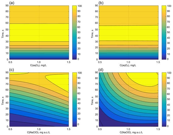 The determination coefficients of the obtained models are 0.9999, 0.9998, 0.9600, and 0.9996, respectively, indicating a high functional relationship between the measured and modeled results. The observed slight decrease in efficiency with increasing time, as seen in the graphs (Figure 1), is because the values of microorganism inactivation efficiency quickly rise from 0 to almost 100%, and the polynomial model cannot precisely fit the measured points, leading to its slight bending.
