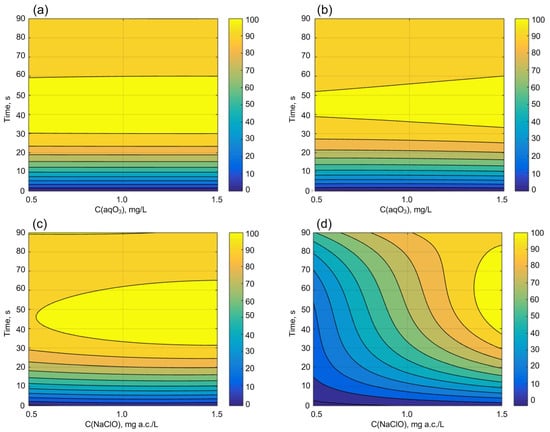 The results of a comparative analysis of the effectiveness of inactivating yeast-like fungi Candida albicans, Gram-positive Bacillus subtilis, and Gram-negative bacteria Escherichia coli by aqueous ozone and sodium hypochlorite solutions, immobilized on metal and polymer plates, are presented in the Supplementary Materials in Figures S1–S9. These data were used for mathematical treatment by defining regression equations and visualization of dependence between the variables (time of exposure and concentration) on the effectiveness of microorganisms inactivation (Figure 1, Figure 2 and Figure 3). Also, this data were used for further comparative analysis of the effectiveness of the inactivation of selected groups of microorganisms by the C·T criterion, which is widely used for comparative analysis of the microorganism’s inactivation efficiency (as further explored in the Section 4).
