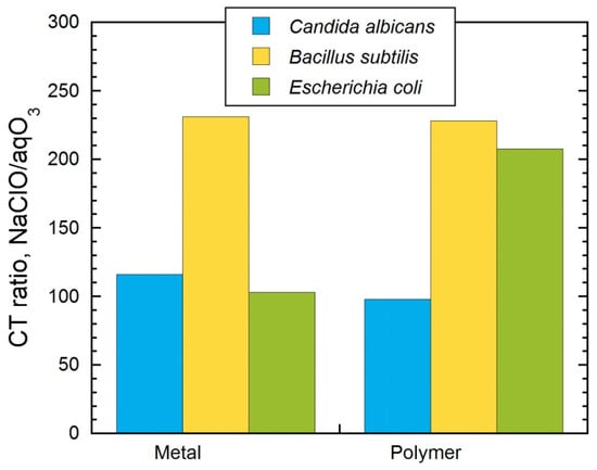 According to the obtained data in this experiment, the aqueous ozone solution is equally effective for the inactivation of yeast-like fungi Candida albicans, as well as Gram-positive Bacillus subtilis and Gram-negative bacteria Escherichia coli, regardless of the substrate (metal or polymer). Also, when using sodium hypochlorite, there was no significant difference in using different substrates for the inactivation of yeast-like fungi Candida albicans, as well as Gram-positive bacteria Bacillus subtilis. Yeast-like fungi proved to be the most easily inactivated, while Gram-positive bacteria Bacillus subtilis showed the highest resistance. Based on the presented results (Figure 4), we can conclude that sodium hypochlorite and aqueous ozone did not affect either the metal or polymer substrates during a short period of aqueous ozone or sodium hypochlorite exposure, like polymer degradation or any reasonable active corrosion of the metal surface. At the same time, the type of substrate had the most significant impact on the inactivation of Escherichia coli. Here, the C·T criterion on a metal plate is 2.04 times lower than during inactivation on a polymer plate. This means that Escherichia coli has a good connection with the polymer substrate and possibly forms the kind of biofilm during the incubation in a thermostat for 24 h at the optimal temperature.