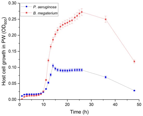 The growth curve of the B. megaterium and P. aeruginosa cells in low-salinity sterilized PW revealed that healthy colonies can proliferate in these water samples during the tested period (48 h). An OD600 ranging from 0.01–0.35 AU was observed in the host cultures during the first 26 h (Figure 1). Afterwards, the OD600 slowly decreased until the 36th hour and more rapidly up to the 48th hour. Precipitation of cellular debris was observed with the decrease in OD600 suggesting cell death, probably due to insufficient nutrients in the water sample.