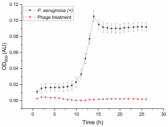 The impact of the specific lytic phage SN on the growth of the P. aeruginosa strain HER-1018 in PW after 24 h of incubation at 37 °C is illustrated in Figure 2. Complete inhibition of P. aeruginosa growth is evident when the phage is co-incubated with the bacterium, contrasting with the normal growth observed in the absence of the phage. A noticeable sharp increase in P. aeruginosa colonies is observed in the control, indicating uninhibited bacterial growth. However, the addition of the phage treatment effectively hinders the growth of the host population, leading to the complete eradication of P. aeruginosa after 24 h of treatment. The Wilcoxon sign rank test confirmed the inhibitory effect of P. aeruginosa bacteriophages on the growth of the host cell. The median, post-phage treatment was significantly lower than the control (Z = −4.4447, p < 0.05) (see Table S1).