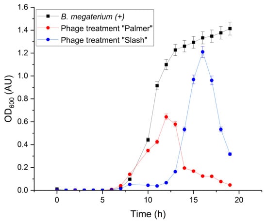 The response of the B. megaterium host to the specific lytic phages, Slash and Palmer, in PW after 24 h of incubation at 37 °C is shown in Figure 3. The absorbance measurements of B. megaterium growth co-incubated with the Slash phage show inhibition of the host growth until the 8 h mark, when an increase in the OD600 values is observed. Interestingly, the absorbance quickly drops after 12 h of interaction with the phage, contrasting the increasing rate of the singly incubated host. A similar behavior is observed with B. megaterium when treated with the Palmer phage. These results indicate inactivation of the host cells. The statistical t-test for two independent samples corroborated that the Slash bacteriophage treatment (M = 0.2591, SD = 0.3914) does limit B. megaterium cell growth (M = 0.6238, SD = 0.6287) in PW, n = 19, t = 2.1471, p < 0.05 (see Table S2). Similarly, the Palmer phage treatment (M = 0.1541, SD = 0.2004) was also statistically significant in regard to the inactivation of B. megaterium cells (M = 0.6238, SD = 0.6287) in PW, n = 19, t = 3.1031, p > 0.05 (see Table S3).