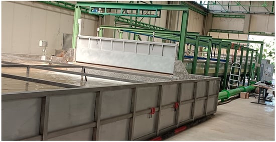 To have further details on the hydrodynamic flow structures in partially vegetated channels, a physical model was realized in a very large channel (Figure 1) at the Coastal Engineering Laboratory (L.I.C.) of the Department of Civil, Environmental, Building Engineering, and Chemistry at the Polytechnic University of Bari, Italy. The channel consisted of base and lateral walls made of glass. The channel was 15 m long, 4 m large, and 0.4 m deep. In a closed hydraulic circuit, the water was pumped from a large steel tank downstream to another upstream, using a Flygt centrifugal electric pump with a maximum discharge of 100 L/s. To create a smooth flow transition from the upstream tank to the flume, a set of stilling grids was installed in the upstream tank to dampen inlet turbulence. A side-channel spillway of adjustable height was also installed in the upstream tank to maintain constant flow-head condition. Any overflow water was discharged via a pipe into the downstream tank. Two electromagnetic flowmeters mounted on the channel’s hydraulic circuit were used to measure the pumped and overflow water discharges with a relative uncertainty of ±0.5%. The net total discharge of the channel was determined as the difference between these two discharges. The channel was equipped with an upstream and a downstream vertically moving gate to define both the depth and the mean velocity of the flow (Figure 2).