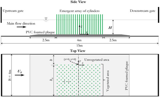 Vegetation is a fundamental component of most natural and artificial aquatic environments. Many aquatic plants such as bamboo (subfamily Bambusoideae), reed (Phragmites australis), as well as many trees which typically can tolerate several weeks of flooding, e.g., the red maple (Acer rubrum), river birch (Betula nigra), hackberry (Celtis occidentalis), sweetgum (Liquidambar styraciflua), tupelo or black gum (Nyssa sylvatica), are characterized by trunks (stems) or a complete body of cylindrical shape. To artificially simulate such a type of vegetation, in this study, we used arrays of vertical, rigid, circular, and threaded steel cylinders. The cylinder height, h, was 23.5 cm, and its diameter, d, was 6 mm. The cylinders were inserted into a bottom of PVC foamed plaque 9.0 m long, 4.0 m wide, and 0.02 m thick. The array of cylinders was partially mounted in a lateral part of the channel, forming the experimental area of 4 m length and bo width. A lateral region immediately adjacent to the left (concerning the main flow direction) channel side, of width b, was left for free flow circulation (see Figure 2). In this study, the measurements were carried out with bo = 2.985 m and b = 1.015 m. Four experimental configurations with different flow depths were investigated. The 2.5 m extension of the PVC foamed, both upstream and downstream of the experimental area with arrays of cylinders, helped to minimize flow disturbance. The cylinders were arranged in a uniform staggered array. The longitudinal and transversal space between two adjacent in-lined cylinders was s = 7.5 cm, giving rise to a density, N, of 355.56 cylinders/m2 and a volume solid fraction of the cylinders φ = 0.010.