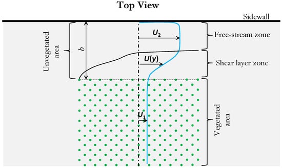 Natural watercourses, i.e., rivers, streams, wetlands, and estuaries, often have distinct vegetated and unvegetated parts, which influence flow characteristics [1,2,3,4]. The presence of vegetation in waterways can have various impacts on the aquatic environment and flow dynamic processes. Vegetation acts as an obstacle in the flow, causing increased friction and flow resistance which results in reduced flow velocities, increased flow depth, and altered flow patterns [5,6,7,8]. Moreover, vegetation plays an important role in stabilizing riverbanks and preventing erosion [9,10], improving water quality by acting as a natural filter [11], regulating water temperature [12], influencing sediment transport [13,14], providing important habitats for various aquatic organisms [15], and affecting flow structure and turbulence which in turn impact the transport processes and diffusion of dissolved species [16,17].