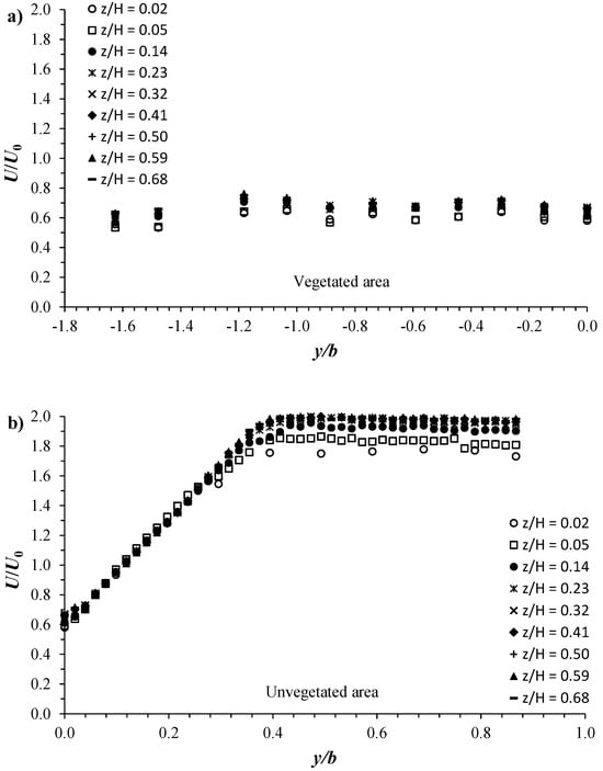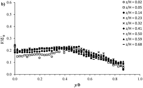 V/U0 plotted versus y/b at different vertical positions z/H for the C1H22 configuration in the (a) vegetated area and (b) unvegetated area.