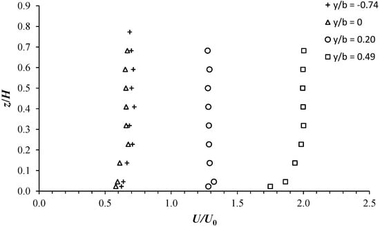 To better understand the flow behavior across the partly vegetated channel, in Figure 5, we plot some vertical profiles of U/U0 at four representative transversal locations: (i) y/b = −0.74, in the vegetated area, (ii) y/b = 0, at the interface between the vegetated and unvegetated areas, (iii) y/b = 0.20, in the shear layer zone, and (iv) y/b = 0.49, in the free-stream zone. In the vegetated area and at the interface (y/b = −0.74 and 0), the vertical profiles of U/U0 show comparable trends and values, with a slight decrease in U/U0 at the interface. This slight decrease in U/U0 at the interface can be explained by a slight increase in transversal flow motion, which will be analyzed below. Figure 5 shows that within the emergent vegetated area (y/b ≤ 0), the vertical velocity profiles exhibit an almost null gradient of U/U0 over z/H > 0.05, making the bottom surface boundary layer compressed toward the bed. These results are in good agreement with the findings reported in Ben Meftah and Mossa [6] and Yang et al. [22]. In the shear layer (y/b = 0.20), the streamwise velocity, along the water column, behaves similarly to that in the vegetated zone. Beyond z/H > 0.05, U/U0 also has a null vertical gradient, leading to a downward compression of the bed boundary layer. In the free-stream zone (y/b = 0.49), the vertical profile of U/U0 appears similar to a classical profile in a bare (without vegetation or bedforms) smooth channel, where the velocity typically follows a logarithmic distribution. At y/b = 0.49, U/U0 increases logarithmically until nearly z/H = 0.23 and then flattens upwards. This indicates that in the free-stream zone, the bottom boundary layer is pushed up against the bed, in contrast to what is observed in the vegetated and shear layer zones.