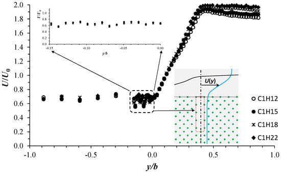 In Figure 6, we plot the normalized streamwise velocity U/U0 versus y/b. The data refer to the four configurations C1H12, C1H15, C1H18, and C1H22, obtained at the flow mid-depth z/H = 0.5. Unlike Figure 4a, in Figure 6, we also consider additional data measured in the vegetated area from y/b = 0 to y/b = −0.15, as shown by the enlarged region at the top left of Figure 6. Along this distance, flow velocities at very close lateral positions were recorded by moving the ADV probe with a step of 1 cm (Δy/b ≈ 0.01). To allow the ADV to move laterally within the vegetated area, at the end of each configuration, we specifically removed some cylinders from the row at x = 0, as shown by the descriptive sketch in Figure 6. The similarity between the velocity profiles of the different configurations illustrated in Figure 6 confirms almost the same flow behaviors already analyzed with C1H22, as shown in Figure 4. In the different configurations, the three characteristic flow zones appear, with similar relative velocity distribution. The data of U/U0 illustrated in Figure 6 show more dispersion over the lateral distance from y/b = 0 to −0.15. This data scattering reflects the local effect of cylinders on the flow velocity distribution, due to the development of wake structures in which small-scale shedding vortices (on the order of the cylinder diameter) and intermittent fluid acceleration/deceleration occur [6,23]. Contrary to what was observed with C1H22 (Figure 4) and in previous studies [1,2,5,25], Figure 6 shows that in the free-stream zone, U/U0 is not always constant, but undergoes a slight gradual decrease as y/b increases. This is well pronounced with C1H12 and C1H15 as the flow depth decreases. This important finding requires further analysis, carrying out additional experiments, and will be addressed separately in future work.