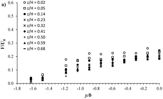Following the same procedure explained previously in Section 3, Figure 7 displays the normalized spanwise velocity distribution V/U0 of the C1H22 configuration plotted against y/b in both the vegetated and unvegetated areas. Inside the vegetated area, Figure 7a shows that V/U0 attains its smallest values at y/b = −1.6, ranging between 0.02 and 0.04 with the different z/H positions. Going towards the vegetation edge, V/U0 increases polynomially, reaching its maximum at the interface (y/B = 0) with the most profiles. In the unvegetated area, very close to the interface, at y/b = 0.02, a slight sharp decrease in V/U0 occurs. Along the width of the shear layer zone, from y/b = 0.02, V/U0 appears to slightly increase in an almost linear fashion as y/b increases. After reaching its maximum magnitude at the edge of the shear layer zone, in the free-stream zone, V/U0 begins to gradually decrease as one approaches the channel wall. In the vegetated area, Figure 7a shows that V/U0 reaches a maximum magnitude near the channel bed at z/H = 0.02, decreasing with increasing z/H. This behavior is reversed in the shear layer zone, as shown in Figure 7b, where V/U0 is of minimum magnitude near the bed at z/H = 0.02, increasing with increasing z/H.