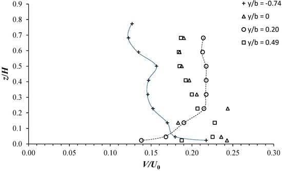 Figure 8 illustrates the vertical V/U0 profiles for the C1H22 configuration at four representative transversal positions: within the vegetated area (y/b = −0.74), at the interface between the vegetated and unvegetated areas (y/b = 0), in the shear layer zone (y/b = 0.20), and the free-stream zone (y/b = 0.49). Figure 8 indicates the reversible vertical trend of V/U0 between the vegetated and shear layer zones. At y/b = −0.74 (in the vegetated area), V/U0 shows a value of the order of 0.22 at z/H = 0.02 with an almost decreasing trend as z/H increases (dotted profile), reaching minimal values of O(0.12) for z/H > 0.5. In the shear layer zone (y/b = 0.20), V/U0 shows a value of O(0.14) at z/H = 0.02, increases significantly to a value of O(0.21) at z/H = 0.23, and then remains almost constant with a value of O(22) for z/H > 0.23. At the interface (y/b = 0) and in the free-stream zone (y/b = 0.49), V/U0 behaves almost similarly with comparable values, showing a maximum value around z/H = 0.20 and then decreases as z/H increases. This reverse velocity trend along the vertical between the different flow zones could be explained by the presence of downward flow (due to the obstruction by vegetation) and upward flow (in the shear layer) processes, leading to the development of clockwise and counterclockwise vortex cells along the cross-section of the partially vegetated channel.