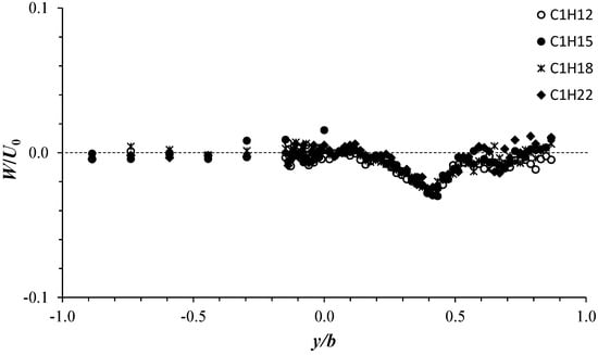 Figure 9 shows the normalized vertical velocity W/U0 plotted against y/b. The data refer to the configurations C1H12, C1H15, C1H18, and C1H22 obtained at z/H = 0.5. Figure 9 highlights that the vertical velocity component is almost null in most of the different flow zones. The collapse of the transversal profiles of the different configurations into a single profile indicates a complete similarity of the W/U0 distribution as a function of y/b. With the different profiles, illustrated in Figure 9, W/U0 shows a slight V-shape decrease between the shear layer and free-stream zones. W/U0 attains a minimum of O(−0.02) at almost y/b = 0.40, position of the shear layer edge. Despite the small magnitudes of W/U0, in the vegetated area (y/b ≤ 0), most of the W/U0 values are negative, confirming the downward flow process in this region. Along almost half the width of the shear layer, W/U0 exhibits positive values where upward flow occurs; going further toward the channel wall, it becomes negative and then positive again. The alternation of W/U0 between positive and negative values confirms the development of flow vortex structures.