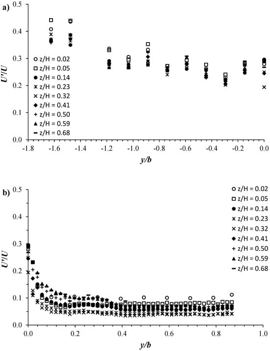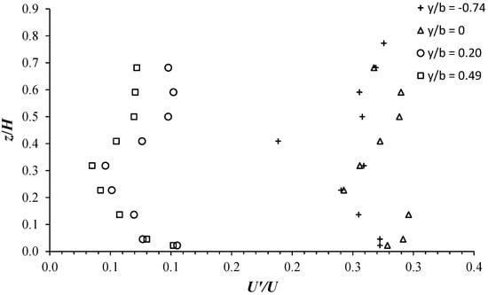 To better understand and predict the impact of vegetation on the flow properties, in Figure 10, we plot the streamwise relative-turbulence intensity U′/U versus the transversal coordinate y/b at various vertical positions z/H for the C1H22 configuration. Herein, U′ (=⟨u′2⟩1/2) is the root mean square of the streamwise velocity fluctuations, u′ is the instantaneous velocity fluctuation, and the bracket indicates the time average. Figure 10a highlights that within the vegetation canopies, U′/U randomly varies with the variation of y/b between values of order 0.2 and 0.45. U′/U shows maximum values further inside the vegetation area at y/b = −1.8 and −1.6, resulting in an almost decreasing trend going towards the interface. From a value of O(0.3) at the interface (y/b = 0), Figure 10b shows that U′/U undergoes a sharp decrease of almost 50% only up to y/b = 0.06. From y/b = 0.06, U′/U decreases monotonically in the shear layer until almost y/b = 0.40. In the free-stream zone, for each vertical position z/H, U′/U shows the smallest intensities which remain almost constant as y/b varies. In the unvegetated area, Figure 10b depicts that U′/U is maximum near the channel bottom (z/H = 0.02), resulting in a decreasing trend with the increase in z/H up to 0.32 and then, an increasing tendency going towards the free-surface flow. This is clearly shown in Figure 11 by the vertical U′/U profiles at y/b = 0.20 and 0.49. In both the shear layer and free-stream zones, the vertical distribution of turbulence U′/U is similar to that obtained in smooth and rough bare channels [27,28]. Figure 11 also highlights, as indicated by the profiles at y/b = −0.74 and 0, the significant effect of cylinder arrays in inducing a further flow perturbation that increases the intensity of turbulence, enhancing mixing and diffusion processes within the vegetated area [18].