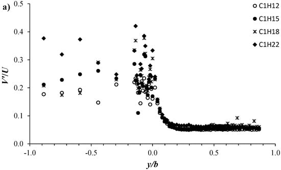 Figure 12 displays the transversal distribution of the flow turbulence intensities V′/U and W′/U at the vertical position z/H = 0.5 for the four configurations C1H12, C1H15, C1H18, and C1H22. Here, V′ (=⟨V′2⟩1/2) and W′ (=⟨W′2⟩1/2) are the root mean square of the spanwise and vertical velocity fluctuations u′ and W′, respectively. It is worth pointing out that in Figure 12, we plot more additional data recorded close to the interface, from y/b = −0.15 to 0, with a lateral step of y/b = 0.01, as clearly explained in Figure 6. Both the spanwise, V′/U, and vertical, W′/U, turbulence intensities have the same tendency of U′/U, as shown in Figure 10. In the vegetated area, V′/U and W′/U show the largest values with notable data dispersion, which is more pronounced along y/b = 0 to −0.15, reflecting the relative effect of proximity to individual stems. In the unvegetated area, the profiles of the turbulence intensities V′/U and W′/U collapse into a single profile, showing an almost harmonic decline trend starting from a maximum magnitude obtained at the interface (y/b = 0). In both the vegetated and unvegetated areas, V′/U shows an intensity comparable to U′/U, while a significant reduction in W′/U can be seen.