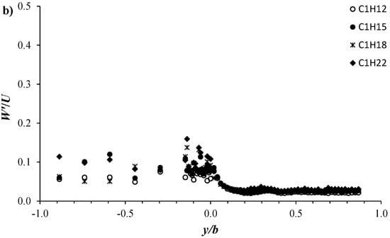 Transversal profiles of (a) V′/U and (b) W′/U at z/H = 0.5 for the four configurations C1H12 to C1H22.
