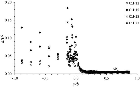 Transversal profiles of k/U at z/H = 0.5 for the four configurations C1H12 to C1H22.