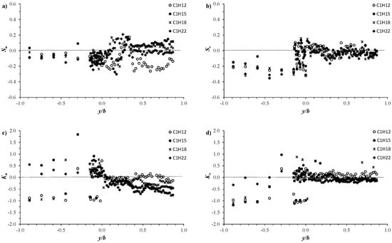 To gain further useful information on flow dynamics in the partly vegetated channel, the skewness and kurtosis factors distribution within the vegetated and unvegetated areas were also analyzed. Skewness and kurtosis are important parameters for describing turbulence, such as the turbulent bursting phenomenon. In addition, they are used to ensure the quality of turbulence measurements, indicating the asymmetry, tailedness, or peakedness of a dataset. The bursting phenomenon can be assessed according to the skewness factors, providing information on the flow exchange between vegetated and unvegetated areas [33]. Figure 14 shows the transversal distribution of the skewness and kurtosis factors for the streamwise and spanwise velocity components obtained at mid-depth flow (z/H = 0.5) for the four configurations C1H12, C1H15, C1H18, and C1H22. Herein, we denote by Su and Sv the skewness factors of the streamwise and spanwise velocity components, respectively, while by Ku and Kv, the kurtosis factors. The skewness and kurtosis factors are defined as follows: