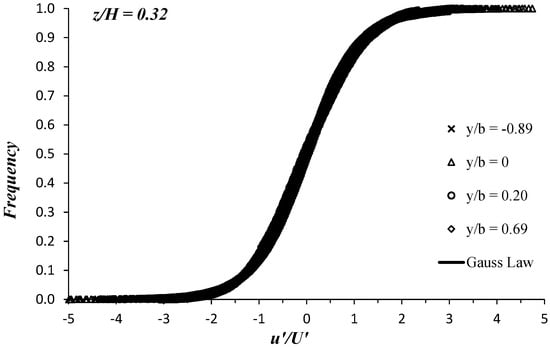 Figure 14 shows that the Ku and Kv data cover a range around zero, and the excess kurtosis (=Ku/v − 3) is always negative in both the vegetated and unvegetated areas. This implies that the velocity fluctuations have small outliers and an approximately symmetric distribution, reflecting the good quality of the measured data, as shown in Figure 15. In Figure 15, we plot the frequency of the normalized streamwise velocity fluctuation u′/U′ obtained at the vertical position z/H = 0.32 with the C1H22 configuration. The frequency profiles illustrated in Figure 15 represent the different flow zones (see Figure 3): the vegetated area at y/b = −0.89, interface at y/b = 0, shear layer zone at y/b = 0.20, and free-stream zone at y/b = 0.69. Data refer to C1H22 configuration at the vertical position z/H = 0.32. Figure 15 highlights that the u′/U′ values are distributed according to a Gauss law with mean zero, affirming the high quality of acquired data in the different flow zones.