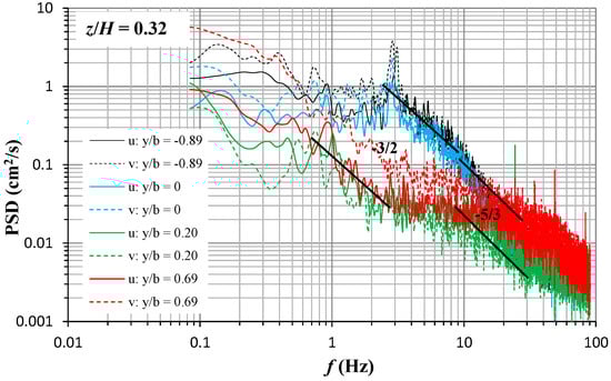 At y/b = 0.20 and 0.69, the PSD expresses lower values than the vegetated area in a frequency range below 10 Hz. The PSD exhibits a driving (production) range with a frequency ranging between almost 0.6 and 3 Hz. At 3 < f < 7 Hz, a less steep slope of the PDS occurs, followed by an inertial range with a −5/3 slope, appearing in a frequency range between 7 and 30 Hz. Figure 16 shows that the PSD of the streamwise and spanwise velocities are comparable in the shear layer zone (y/b = 0.20), while, in the free-stream zone, the PSD of the spanwise velocity component exhibits greater values. This implies that, in the free-stream zone, the spanwise velocity undergoes a greater intensity of fluctuation than the streamwise velocity components, as also confirmed by a variation of U′/U and V′/U around 0.03 and 0.05, respectively.